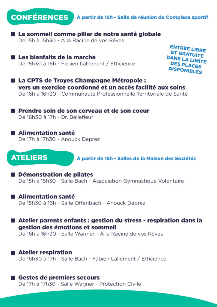 Stands de prévention et d’informations : sommeil, gestion du stress, dépistages, activité physique, alimentation.